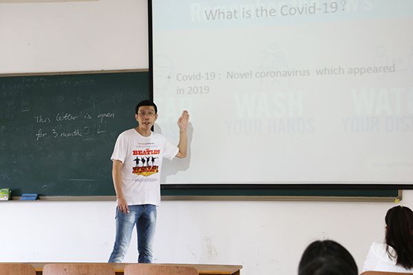 同一时间,在八佾楼上课的沈菲老师,也正在进行着一堂紧扣疫情防控热点的大学英语课。“What is the Covid-19?”带着问题,沈菲老师通过英文ppt,向同学们解释了什么是新冠病毒,如何通过增强体质来抵抗病毒入侵。同时,他还播放了世界卫生组织最新发布的动画短片,指导同学们如何正确佩戴口罩以及在感到不适时怎样求救等常识。