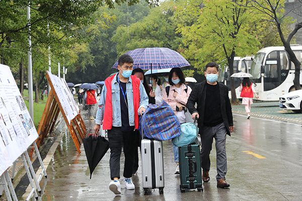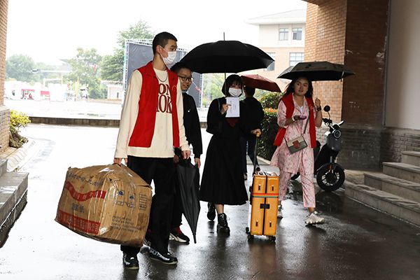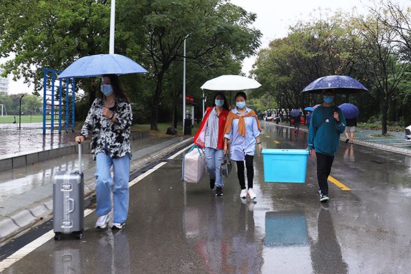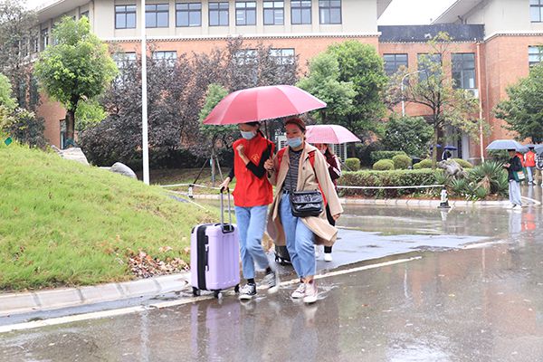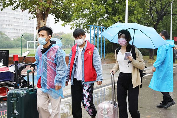 “这两天,我们从早上6点至晚上8点不间断轮班上岗,每天的步行数最多可以达到两万多步。”据迎新志愿服务队的何航同学介绍,在两天的志愿服务中,有的志愿者累计服务了30余名新生,服务时长超过了14小时;有的新生携带的行李多达10件,便由4名志愿者分工协助运送……尽管迎新期间秋雨不断,但在志愿者们的接力服务下,新生们陆续完成了入校手续,顺利开启了大学生涯。