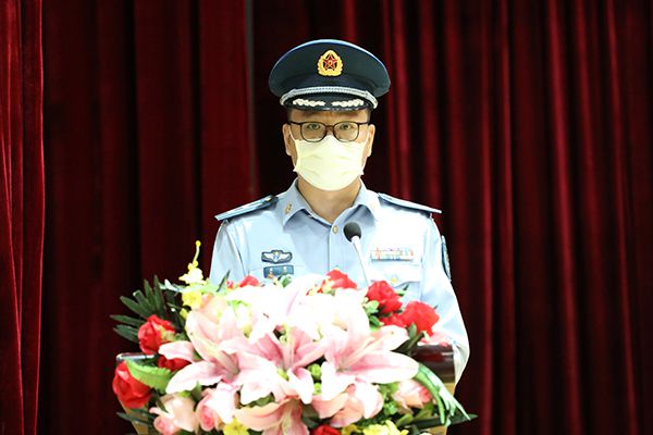 军训工作承训单位、武昌职业学院空军大队大队长苏霖讲话。刘恒 摄
