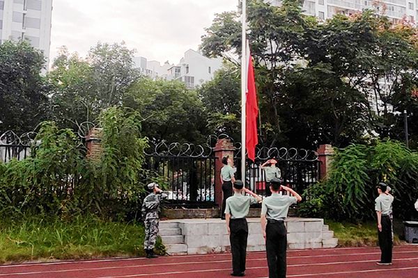 6时10分,与北京天安门广场升旗时间一致,由在校的6名退伍军人学生组成的学校国旗护卫队队员高喊嘹亮的口号,迈着坚定有力的步伐走向升旗台。庄严的国歌响起,五星红旗冉冉升起。