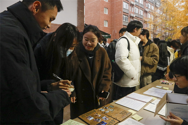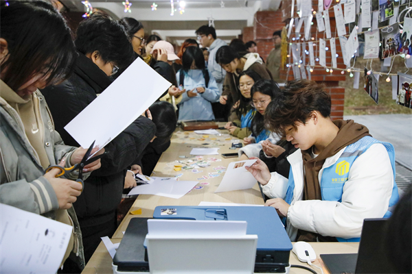 17时许,夜幕降临。智能工程学院“AI心苑”社区门口的连廊处挤满了人,走近一看,大家正围观在展位前,听志愿者讲解如何DIY冰箱贴。现场不少同学正在手机上挑选喜欢的图案,有的已经开始了粘贴和剪裁,略显生疏的动作中透露着专注和认真。“漂亮吧,我亲手做的!”不一会一个心仪的冰箱贴就制作完成了,引来旁边同学的一阵赞叹和羡慕。“扭好的成品精致美观,未扭好的则提供了自由创作的空间。”时尚设计学院“尚美星河”社区的多彩扭扭棒,也备受同学们青睐,通过巧妙扭转,创作出诸如“小蜻蜓”“四叶草”“蝴蝶结”等多种形态各异的精美作品。