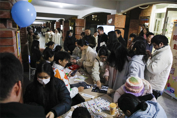 “哇,小猪佩奇,还有HelloKitty!”除了具有现代感的手作,还有融合传统技艺与现代创意的糖画和漆扇制作,在食品与生物科技学院“同创驿站”,同学们以糖为墨、以板为纸,手持糖画笔沿着图案的轮廓慢慢移动,一缕缕糖丝在笔尖流淌,萌趣可爱的图案便逐渐显现。“像山水画一样的书签。”来到公共艺术学院“共美艺苑”处,只见同学们将空白的扇子缓缓沉入漂浮漆料的水中,然后晃动提转,在水波荡漾间,扇子两面逐渐呈现出斑斓的图案,宛如一幅淡雅的水墨画卷。“每一把漆扇都是独一无二的。”志愿者介绍道,如果你要挑战更有技术性的手工,还可以前往成龙影视传媒学院“星光影院”社区,体验“石膏娃娃自塑”制作。