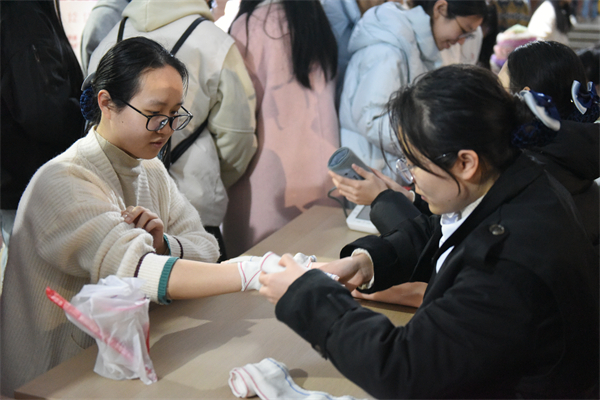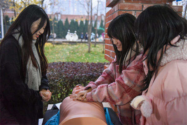 同学们在亚心护理学院“‘心’希望健康驿站”学习心肺复苏和包扎等急救知识。奉颖 摄