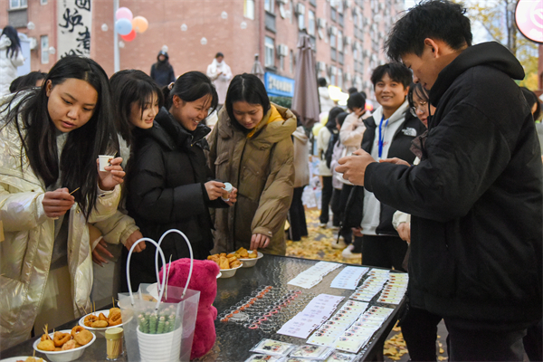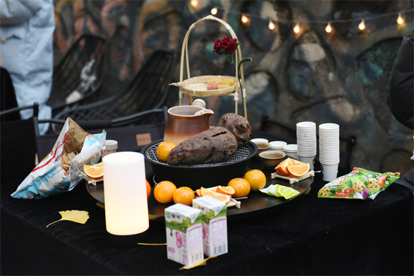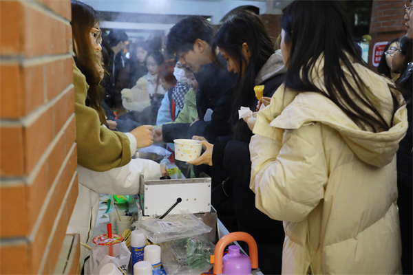 袅袅升起的茶香、烤红薯的香甜,还有满桌的水果、糕点……文化创意管理学院“乐融商苑”社区充满人间烟火,满地黄橙橙的银杏叶如同一席地毯铺在地面,同学们围着炉子坐在一起,煮茶共饮、其乐融融。四号楼前的“同创驿站”,也成为了一个充满创意与乐趣的美食工坊,食品与生物科技学院贴心地为大家准备了DIY关东煮、炖雪梨,现场热气腾腾、香气四溢,吸引众多学生排起了长队,亲手挑选食材,串起一串串美味,大快朵颐。
