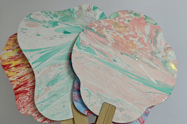 同学们在公共艺术学院“共美艺苑”社区制作的书签和漆扇。沈欣宜 摄