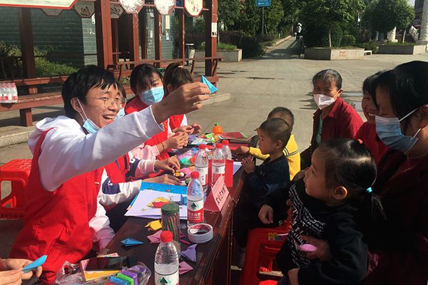 “五色阳光”志愿服务队同学们教孩子们绘画、做手工。