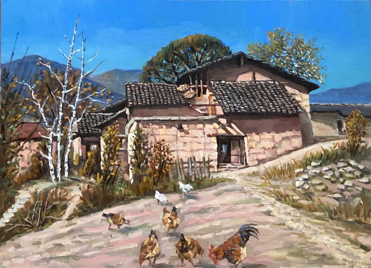 公共基础课部教师宫勋作品《寻根——荆楚印象》描述了家乡湖北省荆门市的乡村一角,淳朴的民风、素朴的老宅、鸡犬相闻的宁静致远令人心向往之。成龙影视传媒学院教师周英俊作品《劳动筑建未来》,运用现实主义表现手法刻画了建筑工人们搭建脚手架的劳作场景,作品通过轻松明快的色调讴歌生活,以当代绘画语言表现时代主旋律,赞美平凡岗位上不平凡的创造。