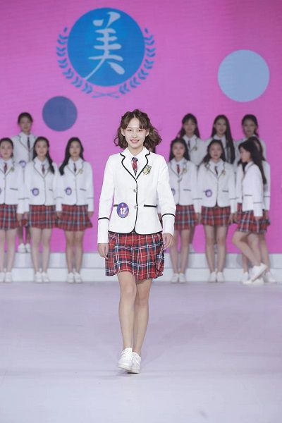 杨杨展示校园服装。