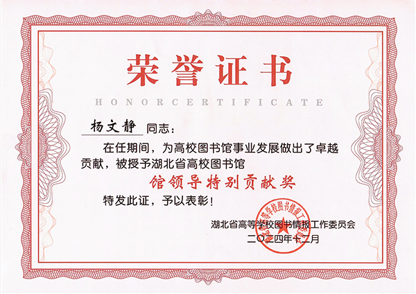 best365图书馆馆长杨文静获评湖北省高等学校图书馆2024年度“馆领导特别贡献奖”。