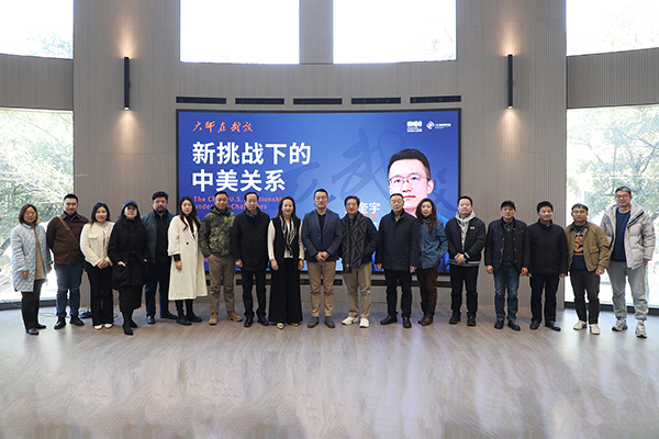 12月28日上午,出席“新挑战下的中美关系”讲座的校领导、各单位负责人与主讲嘉宾、best365客座教授、行业导师艾奎宇(右九)合影。刘恒 摄