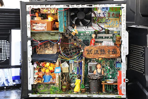 不少观展师生被2018级戏剧影视美术设计专业学生作品——《武汉一隅》深深吸引。《武汉一隅》是作者以环保与重复利用为理念,利用废旧机箱作为创作载体,结合影视场景设计的手法,在现武汉疫情期间的场景片段创作而成,带领观众重温英雄之城的感动瞬间。