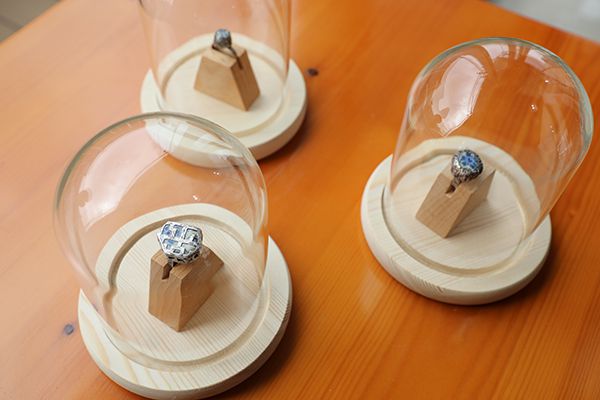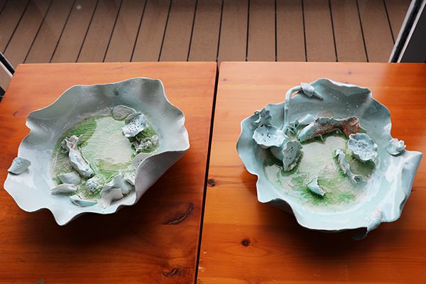 全场最吸睛的作品无疑就是获得本次学生作品一等奖的《观夏》。两方精致的“荷花池”,釉面晶莹剔透亮,荷叶、鱼儿灵动精致,池底碧绿的“池水”夏意扑面。“池水的设计是由绿色和白色的玻璃烧制而成的。一开始我只是加入了白色的玻璃,经过考虑之后又加入了绿色的玻璃,最后才有了这种碧波绿水的轻盈感。”据作者谢玲子介绍,该作品的创作灵感来源于学校夏日的荷花池,因此取名《观夏》。