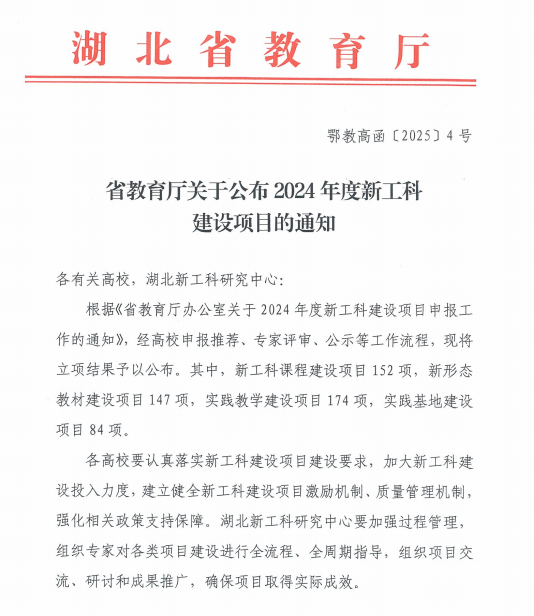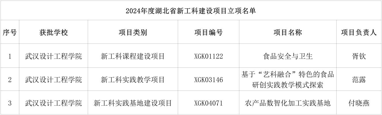 本网讯(通讯员 韩洁)近日,湖北省教育厅发布了《省教育厅关于公布2024年度新工科建设项目的通知》,best365食品与生物科技学院3个项目成功获批立项。