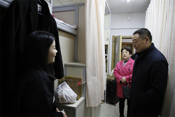 23日下午,校长龚少平、副校长张丽娟来到学生宿舍,看望慰问返校学生。“寒假过的怎么样?”“回到学校后要收收心投入学习了!”“祝愿你们新学期取得新进步!”每到一间学生宿舍,校领导与同学们亲切交流,关切询问假期生活、返校途中见闻等情况,了解同学们的新学期学习计划和安排,鼓励大家要迅速调整状态,以最饱满的精气神迎接新学期,立志在学业、成长等方面取得新突破,并叮嘱同学们要时刻把安全铭记心中,警惕电信网络诈骗,注意宿舍用水用电安全,保持室内整洁和个人卫生,共同创造和谐温馨的“小家”。