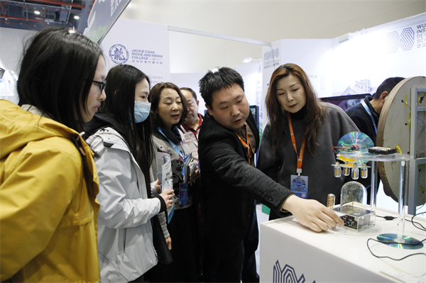 “参展作品来源于成龙影视传媒学院、环境设计学院、公共艺术学院和时尚设计学院,涵盖了影视、游戏、建筑、时尚四大领域。”据教务处处长吴茜介绍,这些作品突破学科壁垒,将艺术与数字技术深度融合,注重科技成果实用价值,运用VR/AR沉浸场域、智能交互系统、数字孪生与3D打印等技术矩阵进行创新表达,体现了艺术科技化、科技艺术化的双向赋能。
