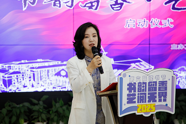 图书馆馆长杨文静在启动仪式上分享了图书馆坚持践行“读者第一、服务至上、书香校园”理念的生动探索与实践。沈欣宜 摄