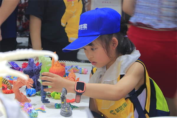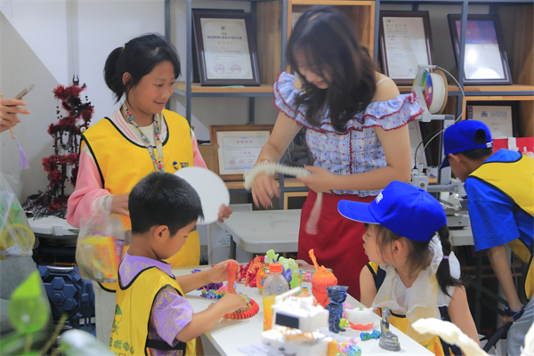 手工工作坊内,孩子们化身“非遗小匠人”,在漆艺老师的指导下,团扇斜斜没入水中,靛蓝与藤黄在水面下交织翻涌,彩色的漆流攀上扇面,一把把“星空漆扇”惊艳诞生;3D打印工作坊,目睹屏幕中的虚拟草图在精密机械臂的勾勒下“破界重生”,当指尖触到3D模型时,惊叹声瞬间点燃整个空间。