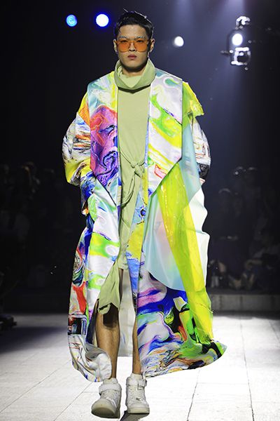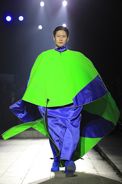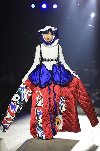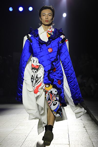 毕业生杨钰莹的作品《楚歌》裁剪利落,配色经典,设计者以汉剧为灵感来源,提取汉剧中较为经典的红蓝配色,再将各类型脸谱分解拼接后,用印花的形式表现出来,制造出服装的层次感。“《楚歌》整体设计以现代款式和中国传统元素相结合,达到一种‘融贯东西’的视觉效果。”杨钰莹介绍。