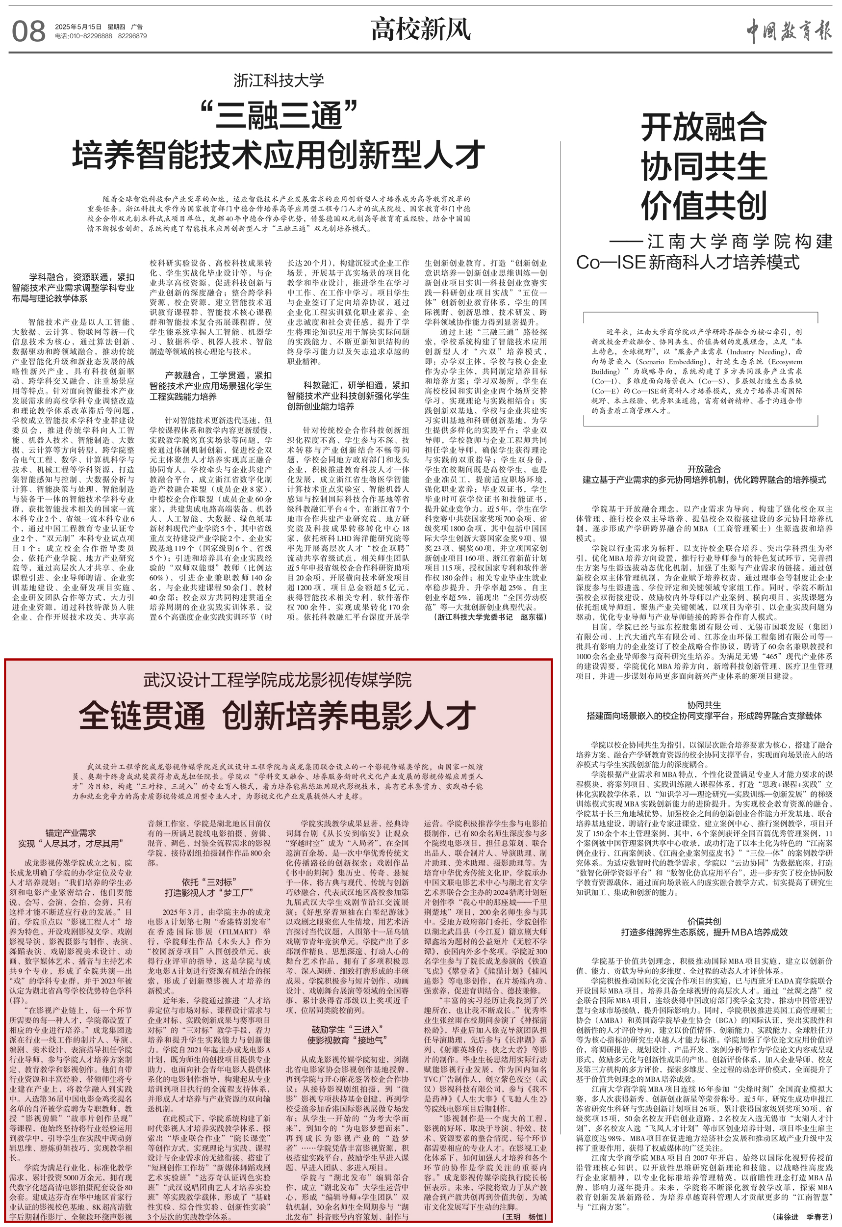 本网讯(通讯员 王玥 杨恒)5月15日,成龙影视传媒学院成立十周年之际,《中国教育报》“高校新风”版(第08版)以《best365中国官方网站成龙影视传媒学院:全链贯通,创新培育新时代电影人才》为题,深度报道了学院立足产业前沿,创新构建“三对标、三进入”育人模式,精准培养服务新时代文化产业需求的影视传媒应用型专业人才。