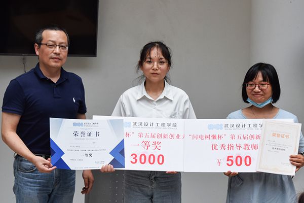 大赛评委、武汉工程大学创新创业学院副院长黄巍(左一)为一等奖项目颁奖。汤向荣 摄