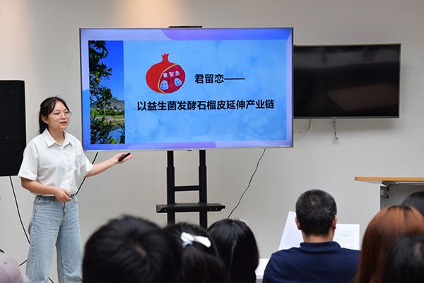 大赛上,食品与生物科技学院《君留恋——以益生菌发酵石榴皮延伸产业链》项目创新性十足,社会经济效益前景颇为可观,赢得评委一致好评。据负责人汇报介绍,目前我国石榴栽培面积已位居世界第一,然而深加工滞后、鲜果滞销、丰产不丰收等问题却普遍存在。团队通过益生菌发酵技术提取石榴皮中的活性物质,开发出具有石榴皮天然活性成分的化妆品和保健品,并以此建立集研发、生产、销售于一体的创新公司,从而推动石榴相关产业链的发展。