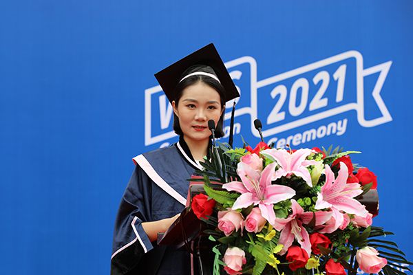 毕业生代表、成龙影视传媒学院播音与主持艺术专业王雨欣同学在典礼上发言。她深情说道:“四年前,我们刚刚踏入校园,四年里,我们有幸见证了武设一步一步地走向更好。”她表示,感恩学校提供了良好的学习平台,感谢老师为同学们传道授业解惑。她代表全体毕业生向母校表下决心,“请母校放心,请恩师见证,请父母相信,我们会用自己的青春书写最绚丽的中国梦,用自己的梦想成就祖国的未来!”