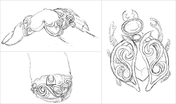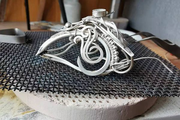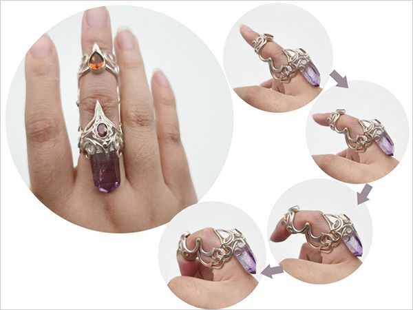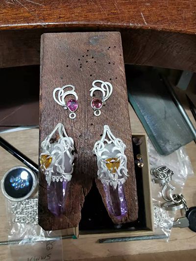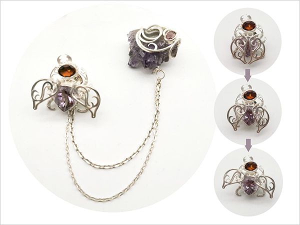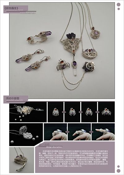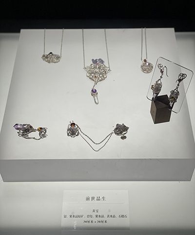 “《前世晶生》的设计初衷旨在传承与弘扬优秀民族传统文化,让民族传统文化融入人民的生活之中。”据黄雯老师介绍,该作品完成于今年5月,部分创作为学院首饰制作工艺课教师示范作品。全套饰品以原生态水晶矿石为主石,搭配天然紫水晶、碧玺、黄水晶和纯银,纯手工打造而成。作品的花纹图案灵感来源于荆楚文化漆器彩绘中的凤鸟纹纹饰,构思上坚持“心手合一”创作理念,巧妙地将饰品集功能、佩戴、把玩于一体,带给观众不一样的惊喜。