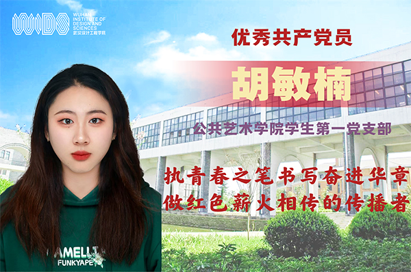 胡敏楠,公共艺术学院广告2102班团支书,2023年5月16日加入中国共产党。曾被评为学校“优秀主席团成员”、“优秀学生干部”,连续三年被评为校级“三好学生”,在AADA2022年北美艺术设计大赛中荣获铜奖;在2023年第二届大学生可持续大赛中获得三等奖;在学校2023年写生采风展中荣获三等奖。