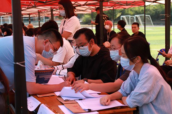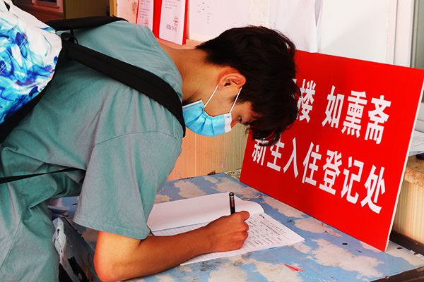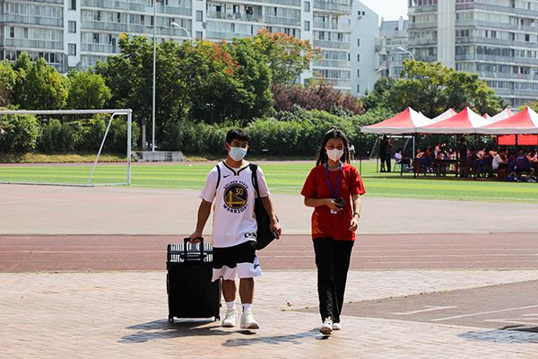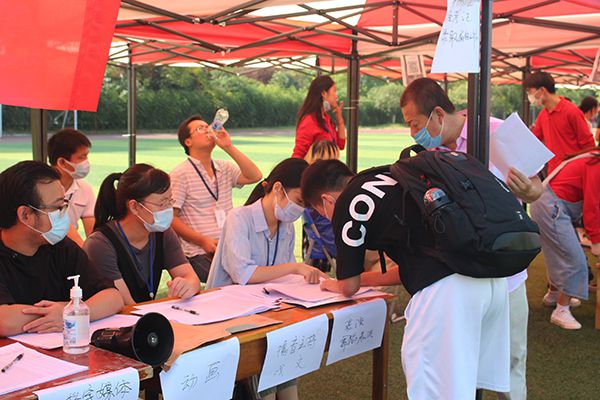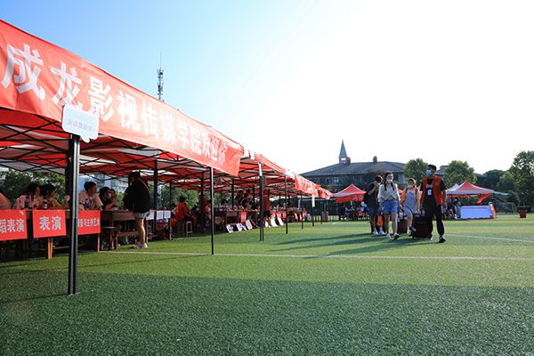 足球场上,各学院报到点标识清晰、整齐有序。各学院工作人员热情地为新生及家长们答疑解惑,和往年一样,今年学校仍旧实行线上缴费和线上分配寝室。来校前,同学们早已通过“完美校园”完成了相关注册手续,来校后只需在各学院报到点进行信息核对,即可前往寝室楼领取钥匙和校园卡直接入住。