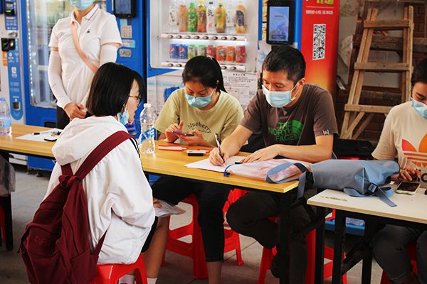 宿舍楼下,新生们领取钥匙后入住。刘恒 摄