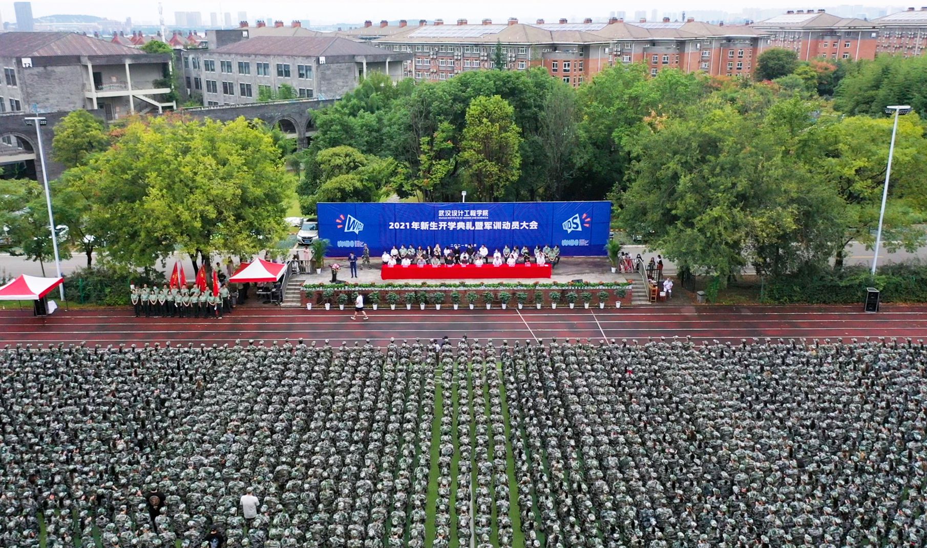 学校董事长程凡,党委书记、省政府教育督导专员冉春桃,名誉校长傅中望,校长龚少平、董事魏彬等校领导和武汉市汉阳区人民武装部政委路庆伟出席大会,学校各部门、各学院负责人,校军训旅各营营长、教导员,教职工代表,2021级本科新生和专升本新生参加大会。