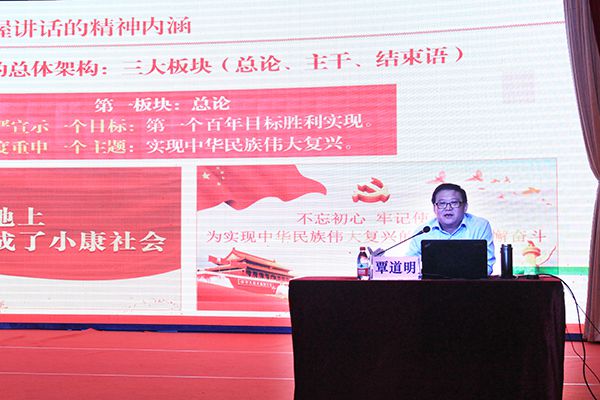 宣讲会上,覃道明以《百年大党引领新时代的政治宣言和行动纲领》为题,围绕“深刻把握习近平总书记‘七一’重要讲话的精神内涵”“深刻把握党的百年奋斗主题”“深刻把握第二个百年奋斗目标的根本要求”三个方面展开阐述。