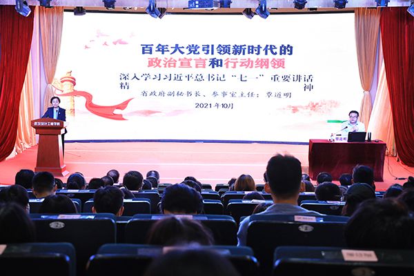 湖北省委党史学习教育宣讲团成员,湖北省政府副秘书长、参事室主任覃道明来校作学习习近平总书记“七一”重要讲话精神宣讲报告。王雨婷 摄
