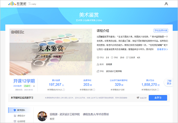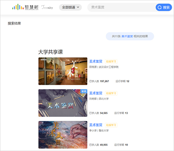 《美术鉴赏》课程在智慧树公共慕课平台上选修人数近20万,选修人数位居同名课程第一。
