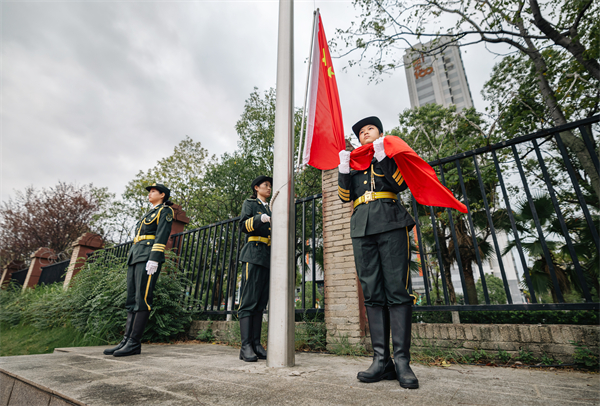 全体师生齐唱国歌,凝视鲜艳的国旗在晨光中冉冉升起。赵启航 文政 摄