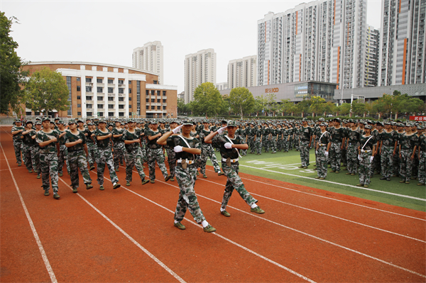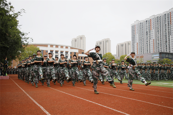 “迎军旗!”“标兵就位!”学生军训分列式开始。各方阵以整齐划一、铿锵有力的步伐稳健前行,如钢铁洪流般行进至主席台前接受检阅。他们身姿挺拔,昂首挺胸,目光如炬,坚毅与果敢的神情中透着青春独有的蓬勃朝气,每一步都踏出青春的磅礴力量,彰显着新时代青年的风采与担当。领导们立于观礼台上,神情专注而严肃,目光中满是肯定与期许。