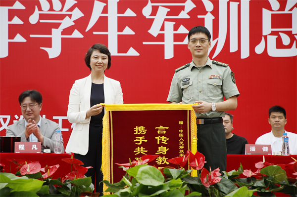 王长华在讲话中向承训部队领导与教官致以崇高敬意,向参训全体老师表达亲切慰问,向全体参训同学致以最热烈的祝贺。“铁流奔涌处,是迷彩青春的磅礴交响;方阵如山时,是强国一代的铿锵誓言!”她期待同学们将“美在武设”的文化基因,深深地烙印在青春之中,在武设这个最好的“课堂”、最好的“舞台”,坚定理想信念,厚植家国情怀,铸牢“信仰之美”,凝聚奋进力量;坚持青春梦想,彰显青春风采,塑造“青春之美”,展示个性风采。勇于挑战,敢于创新创造,传承“创意之美”,点燃创新火花。她勉励同学们要以青春之名立大志,以奋斗之姿担使命,用青春之美、奋斗之美、成长之美,为“美在武设”标注自己的专属注脚,书写“请党放心,强国有我”的铮铮誓言,展示新时代武设青年的美丽姿态!