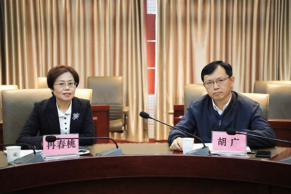 学校党委书记冉春桃与红安县县长胡广亲切交流。刘恒 摄