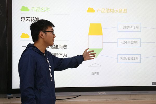 决赛答辩现场,各小组负责人依次上台汇报各自产品创意、制作包装、市场定位、成本预估、营销方案等,通过全方位、多方面的短视频展示材料选材、加工工艺等制作过程,评委专家对提交的短视频作品和策划书进行提问答辩。