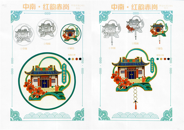 文创设计组的同学们将深刻的理论感悟倾注于指尖创作,让文化意蕴在精巧设计中焕发新生。何金涛同学的作品《青山绿水 金缕云纹》徽章,巧妙提取传统云纹的灵动韵律,又融入现代生态理念的鲜活意象,将“绿水青山就是金山银山”这一深刻发展理念,凝练成一枚可佩戴、可传递的艺术符号,让环保思想随饰品流转,兼具美学价值与精神内涵。李丹同学则聚焦红色文化与校园底蕴的双向赋能,其创作的《中南 红韵赤岗》文创冰箱贴,以明快热烈的色彩勾勒精神底色,用简练大气的造型定格校园记忆,将深厚的家国情怀与昂扬的时代精神融入日常物件,让红色基因在生活场景中自然传承。