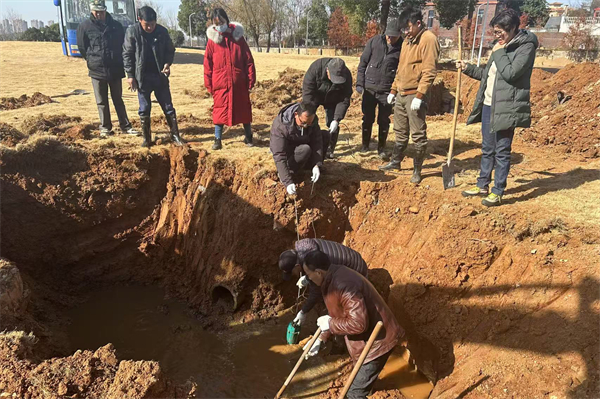 2024年寒假期间,王明明(左一)带领工人排查地下管道漏点。