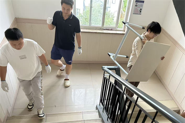 王明明(右一)同后勤员工一起调配新生宿舍座椅。