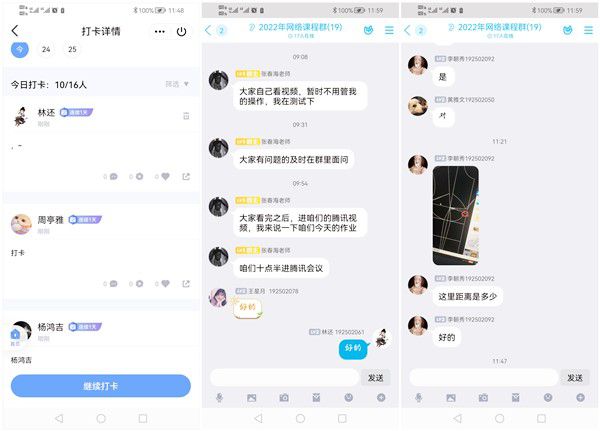 师生们在网络课程上签到打卡、提问互动。