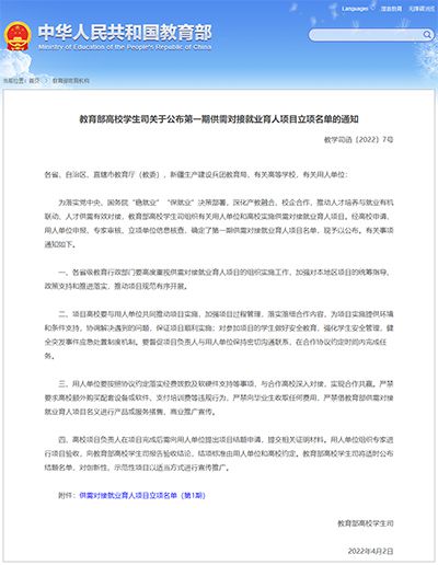 据了解,本项目是教育部落实党中央、国务院“稳就业”“保就业”决策部署,深化产教融合、校企合作,推动人才培养与就业有机联动、人才供需有效对接,教育部高校学生司组织的有关用人单位和高校实施供需对接的就业育人项目。