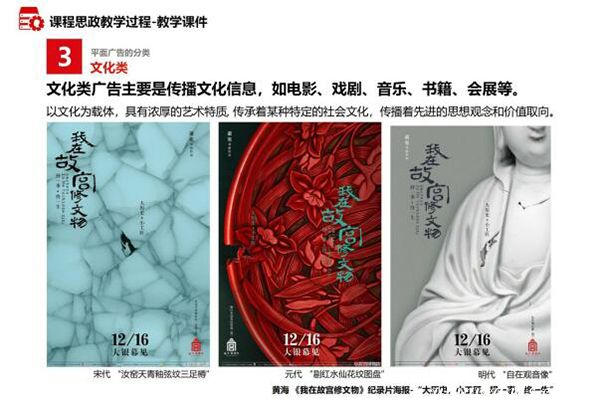 本网讯(记者 江淼)“海报中的图形元素是元代的剔红水仙花纹圆盘。在这个圆盘中还隐藏着另外一个形态,同学们找到了吗?没错,在圆盘的边缘有一名正在进行修复作业的工匠,海报通过隐喻传达了‘大历史,小工匠,择一事,终一生’的工匠精神。”在《平面广告设计》课上,公共艺术学院教师张慧娟正在与同学们一同赏析经典海报《我在故宫修文物》。
