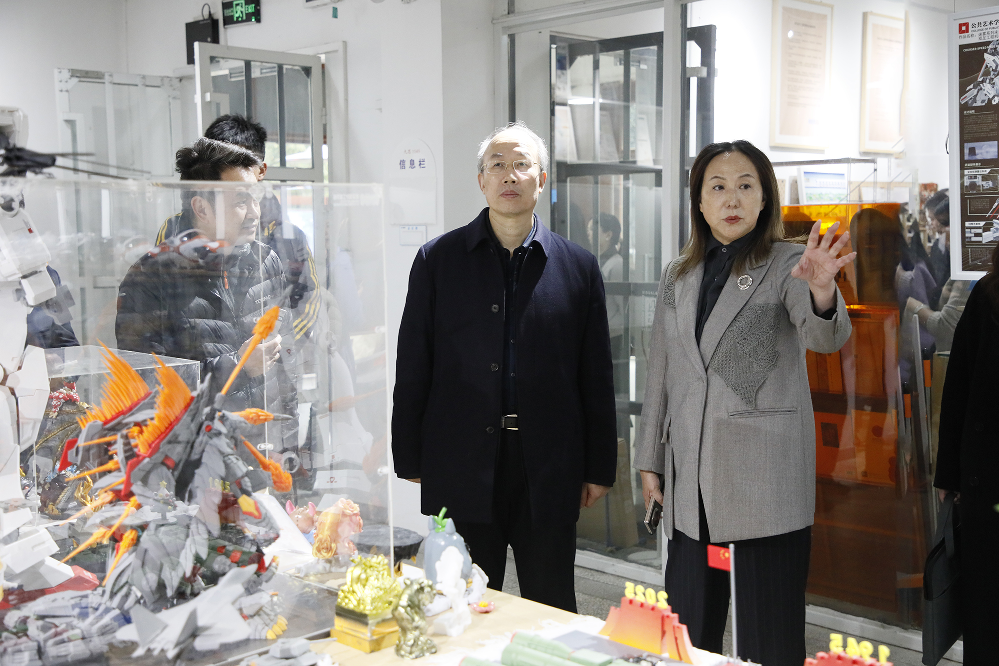 交流会前,在王长华、魏彬陪同下,杨震一行实地参观了学校美术馆以及成龙影视传媒学院、公共艺术学院、时尚设计学院的美育长廊。