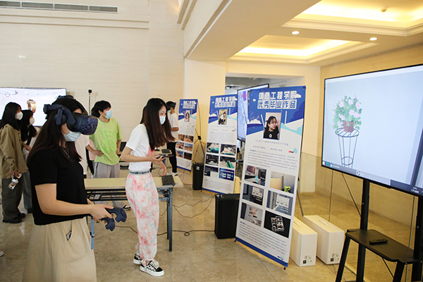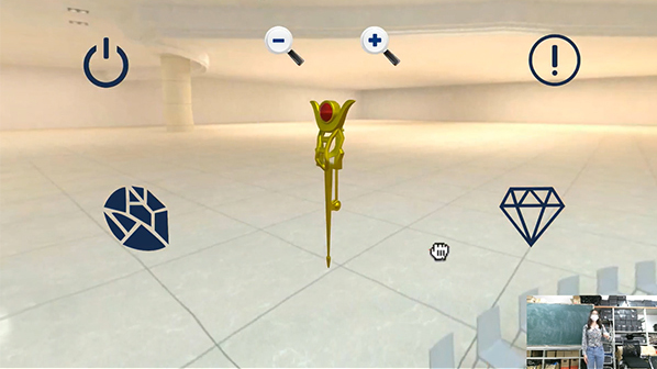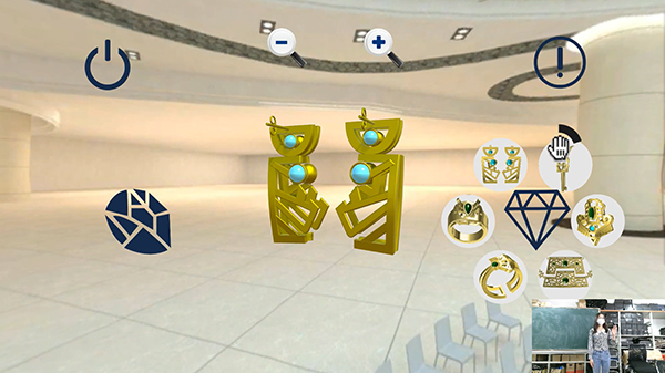 信息工程学院数字媒体技术专业刘嘉琪同学的毕业作品是学校跨专业联合毕业设计作品的典型代表。他设计的虚拟展示系统——《神明·源起》通过将产品设计专业同学设计的珠宝作品建成等比例立体模型,再通过虚拟展示、人机交互等技术将珠宝首饰进行三维数字化呈现。当用户进入虚拟展示界面后,只需要通过简单的手势操作便可以自由地控制珠宝切换、旋转和缩放。该系统为贵重珠宝物品的展示提供了更加安全的呈现方式,为广大珠宝客户带去了更加便利的体验感受。系统后台算法也为商家分析提取用户习惯,提升客户服务质量提供了可靠的数据支撑。