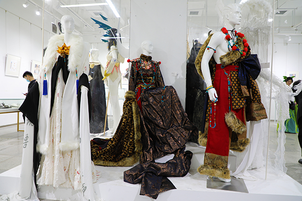 走进时尚设计学院展区,演艺服装设计方向学生联合服饰表演与推广方向学生共同为观众带来了一出远古神话,从服饰、妆容到发型和道具均是由学生自行设计、绘制和制作完成的。服装与服饰设计专业毕业生陈嘉怡同学的《一天云烟》,结合中国传统戏曲元素和西藏地区服饰文化特色,对昆仑神话角色进行了大胆创新。不一样的神话形象让人物角色设定更加丰鲜明、贴切。参与该套服装表演的19级服饰表演与推广方向学生吉歆雨介绍:“我扮演的是《一天云烟》中西王母的角色。在前期准备的时候了解到西王母是中国神话里掌管罚恶、预警灾厉的长生女神,所以我特意将她演绎成霸气沉稳的女性形象。穿上这套衣服的时候我能感受到设计师的用心,因为从衣服的花纹到配件都太精致华丽了。”