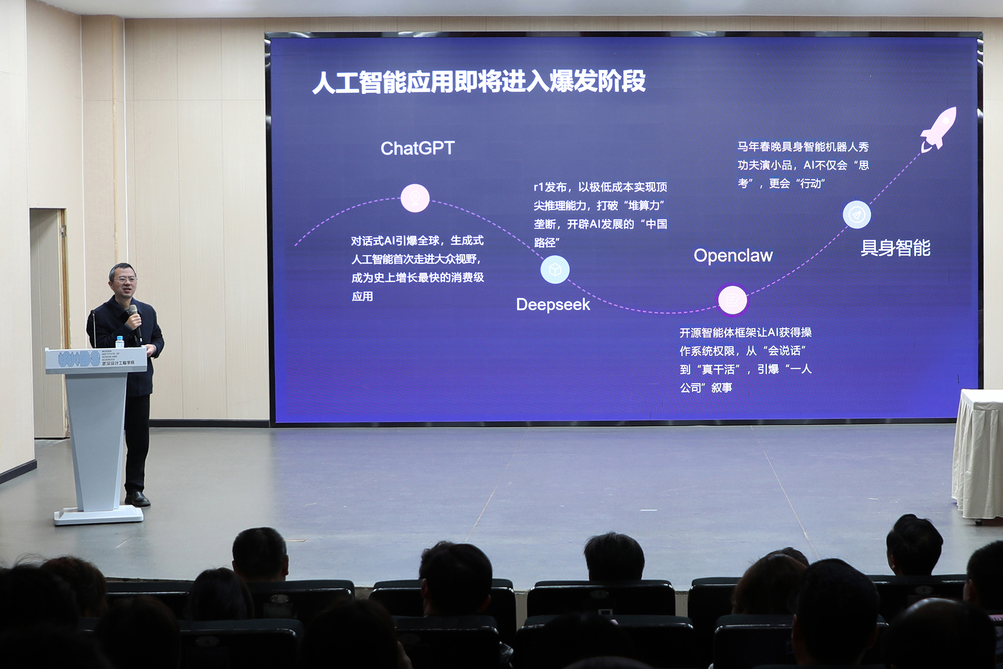 沈国良以《科技产业变革对教育体系的影响探讨》为题作报告。他系统梳理了科技产业革命演进脉络与内在逻辑,深入分析了人工智能浪潮下教育体系面临的机遇与挑战。他提出,学校应从人才培养、学科建设、产教融合、创新发展、学科交叉等方面协同发力,着力探索人工智能与教育教学深度融合的实践路径。