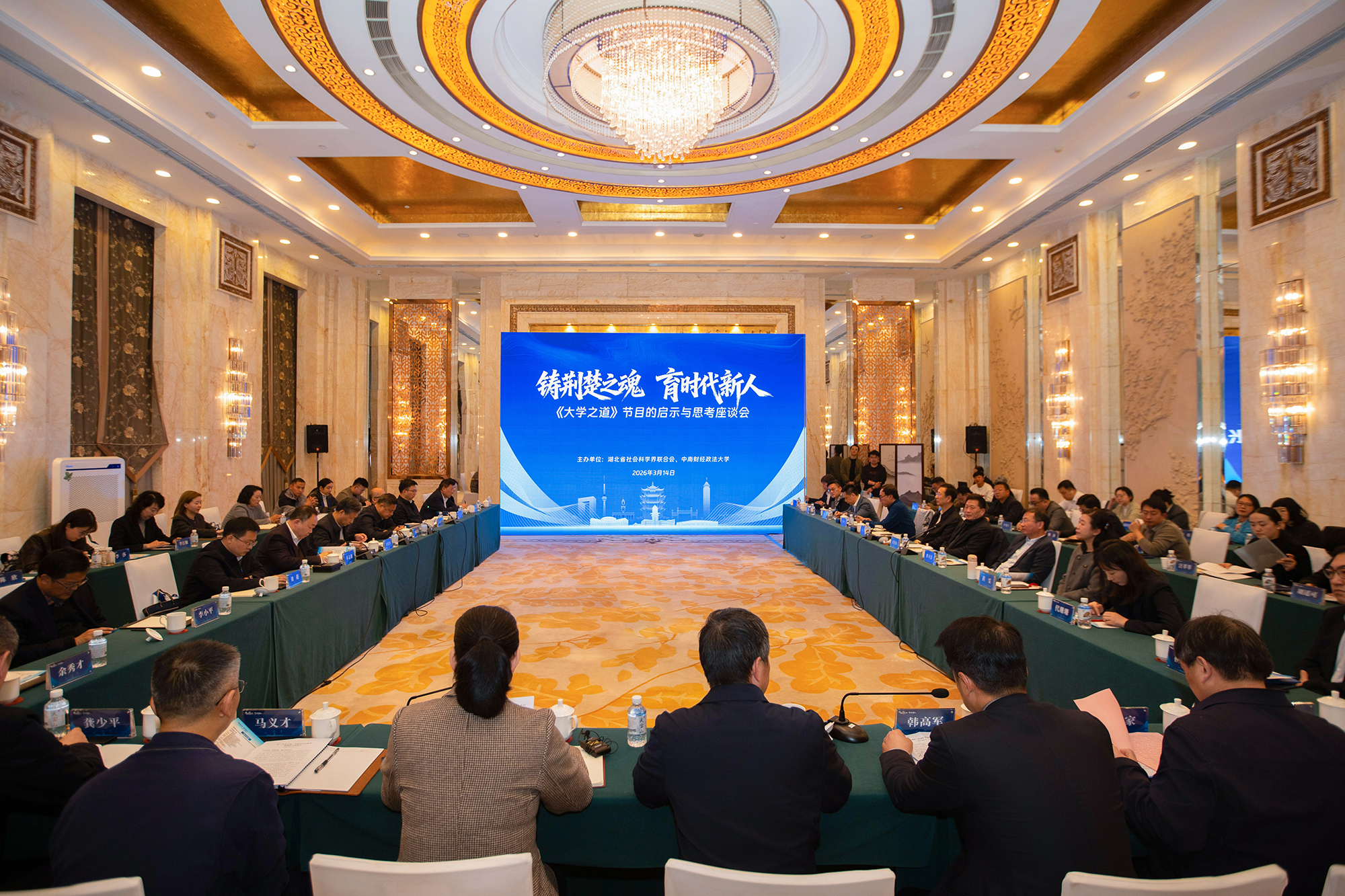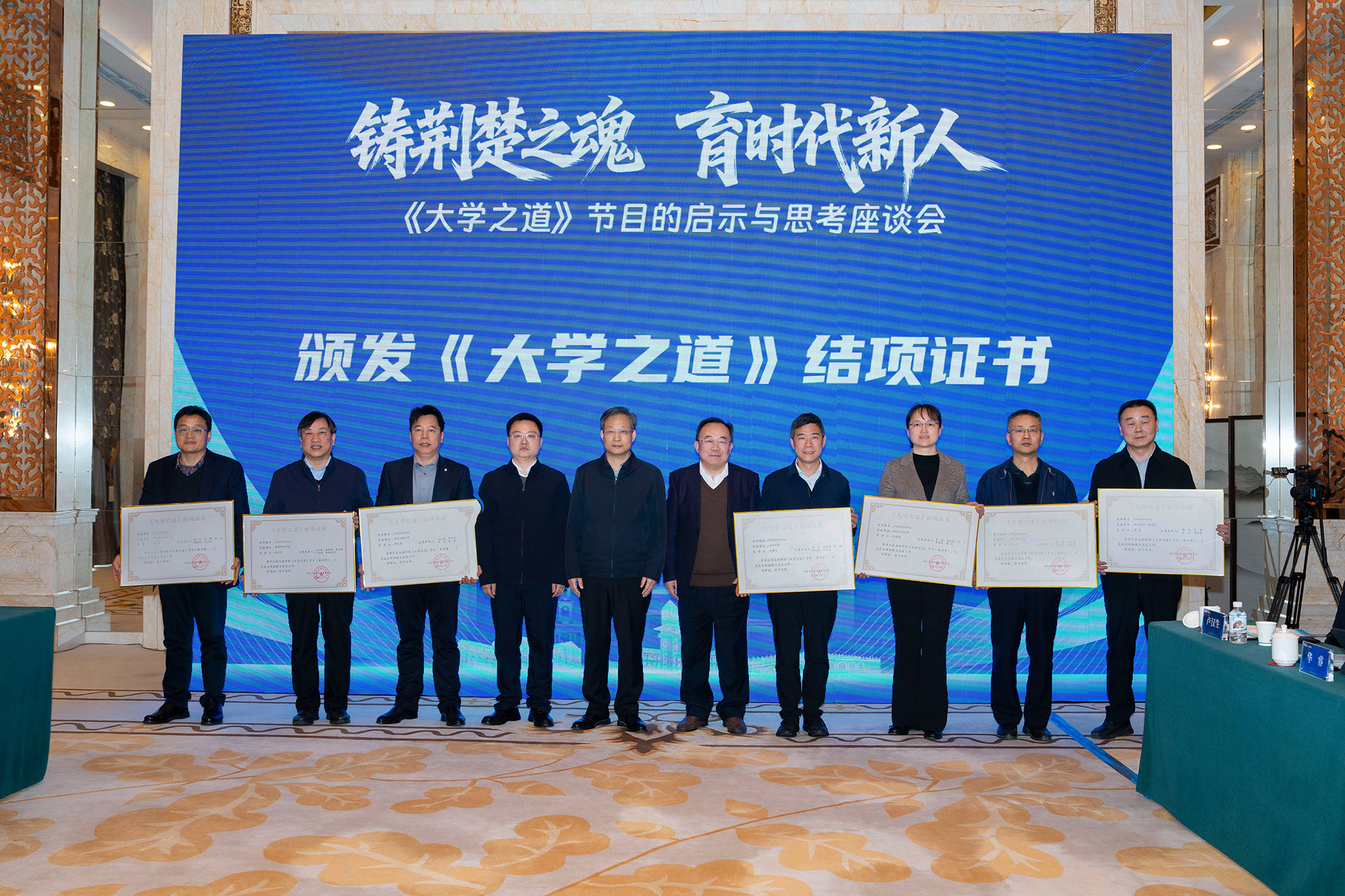 本网讯(通讯员 章凌 曾智)3月14日,由省委宣传部和省教育厅指导,湖北省社科联、中南财经政法大学联合主办的《大学之道》节目的启示与思考座谈会在武汉举行。校长龚少平出席座谈会,与来自国家广播电视总局、中国电视艺术家协会、中央广播电视总台、中国广播影视报刊协会,以及复旦大学、中国人民大学等单位的50余名专家学者、行业代表齐聚一堂,围绕高校思政育人赋能等议题展开深入研讨。会上,学校获颁《大学之道》结项证书。